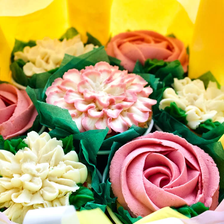 Freshly baked and decorated as flower petals, your beautifully wrapped cupcakes can be customised with a custom topper to mark a special occasion. Ask about our delivery service!